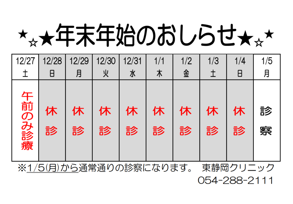 12月29日(月)~1月4日(日)は年末年始休暇となります。
